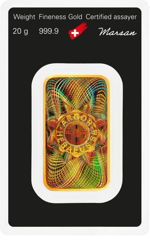 Minted from 20 grams of 99.99% pure gold, this Kinebar features the proprietary Kinegram® holographic design on the reverse — a striking, light-responsive security element that not only enhances visual appeal but also provides an additional layer of authentication. The obverse bears the Argor-Heraeus hallmark, gold purity, weight, and a unique serial number for full traceability.
